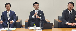 11月20日の記者会見(高木功介(中央)、諸井真英両埼玉県議(右)と奥富精一川口市議)