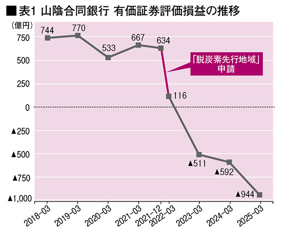 本誌が前号で告発した合銀の再エネ子会社「ごうぎんエナジー」の設立は、合銀本体の含み損が膨れ上がるプロセスと重なっている。含み益500億円が消失した最中の22年2月に米子市と境港市は環境省へ「脱炭素先行地域」の申請をし、同年4月に両市が先行地域に採択されると、合銀は3カ月後の7月に受け皿となるごうぎんエナジーを創業。同年11月には銀行法改正に基づく「銀行業高度化等会社」の枠組みを立ち上げ、再エネビジネスを本格化させていく。