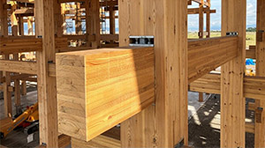 古来のやり方だけでは現在の耐震性能を確保できないため、柱や梁には高強度の集成材を採用した。さらに接合部を金属パーツで補強しているが、実は3工区でやり方が異なる。「北東工区」は大林組・大鉄工業・TSUCHIYA共同企業体(JV)が請け負い、「南東工区」は清水建設・東急建設・村本建設・青木あすなろ建設JV、「西工区」は竹中工務店・南海辰村建設・竹中土木JVが担当した。