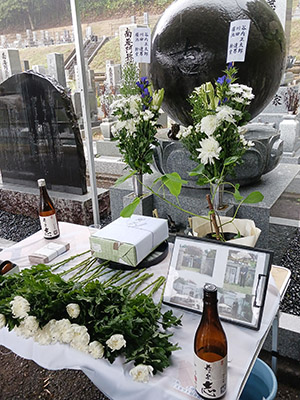若泉が書いた「志」の文字が刻まれた地球儀状のお墓の前で