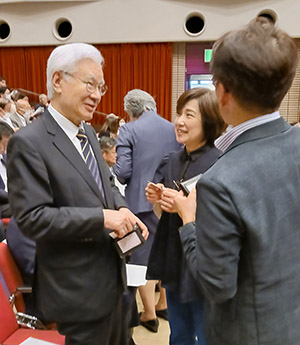 「生誕95周記念イベント」会場で談笑する谷内正太郎氏(左)