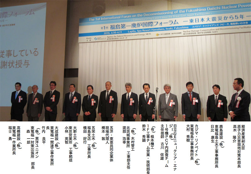 この他、1F港湾海底土被覆工事をやり遂げた五洋・東亜共同企業体と協力企業の五栄土木、大新土木の作業チームと、高濃度に汚染されたタンクの解体工事を無事故で成功させた大成建設と協力会社の東洋ユニオン、高橋建設の作業チームには、私から感謝状を差し上げました。