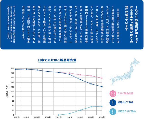 加熱式たばこの販売開始に伴って紙巻たばこの消費量が4年で34%も減少(*3) しました。