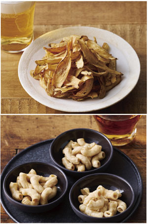 「ごぼうチップス」(上)と「おつまみあげマカロニ」3種類(下)