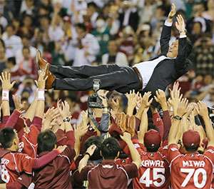 パ・リーグ初優勝。胴上げされる楽天の三木谷浩史オーナー(13年9月26日)